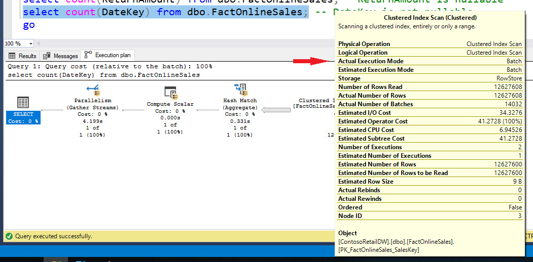These simple queries were chosen because they do not require the processing of many columns within the row data, and are therefore good candidates for batch processing. We can change the database compatibility level from 140 to 150 to compare performance with and without the option of batch processing