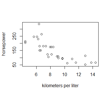 plot(mtcars$hp ~ I(mtcars$mpg * 0.425 )