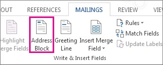 - On the Mailings tab, in the Write & Insert Fields group, choose Address Block.