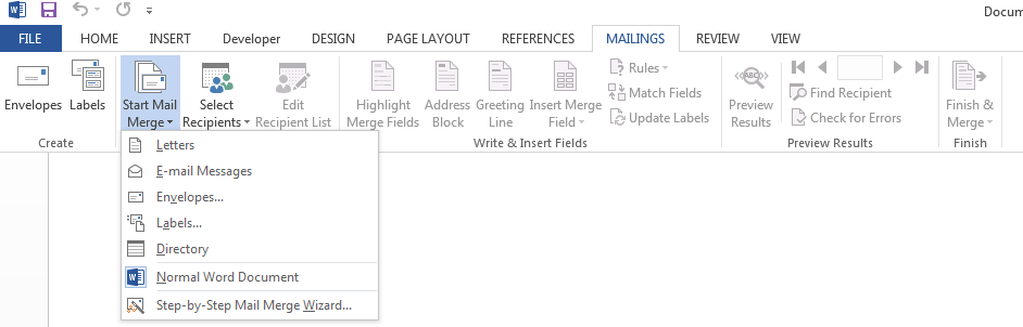 - On the Mailings tab, in the Start Mail merge group, choose Start Mail Merge and choose the merge you want to run.