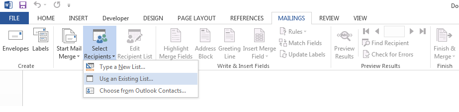 Second Step: Start the Word mail merge process from the Ribbon Menu