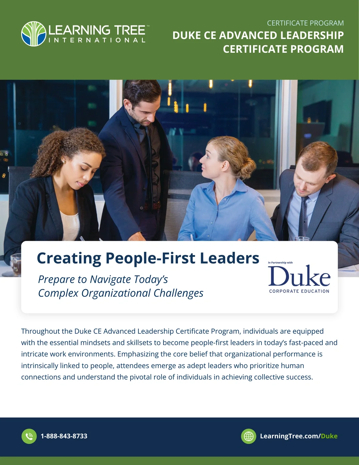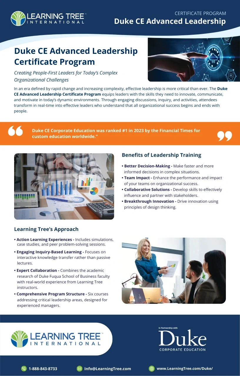 - Ranking and Collaboration: Duke CE was ranked #1 in 2023 by the Financial Times for custom education worldwide. The program combines Duke CE's leadership education with Learning Tree's experience in training technologists.